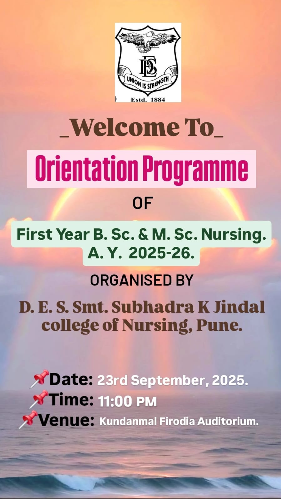 The name of College has been changed from ‘DES College of Nursing’ to ‘D.E. Society's Smt. Subhadra K. Jindal College of Nursing.’ From Academic Year 2012 -13